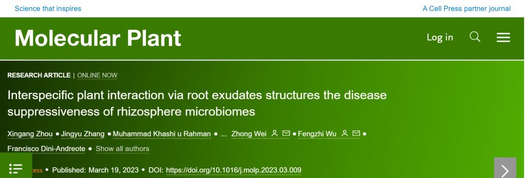 3月19日,我校吴凤芝教授、周新刚研究员等在解析植物多样性种植提高植物生产力机理方面取得重要进展,成果以《Interspecific plant interaction via root exudates structures the disease suppressiveness of rhizosphere microbiomes》为题发表于Cell子刊、植物科学领域国际权威期刊《Molecular Plant》(影响因子:21.949),我校为第一完成单位。该研究揭示了根系分泌物介导的植物种间互作通过诱导作物根系分泌物变化促进有益微生物根际定殖,从而抑制作物土传病害。(全文链接:https://www.cell.com/molecular-plant/fulltext/S1674-2052(23)00073-4)